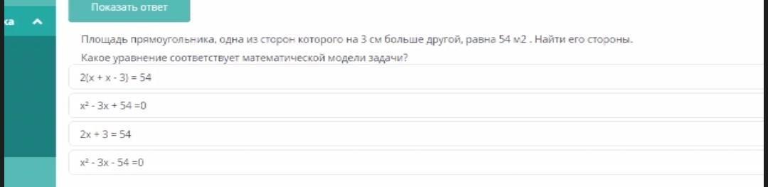 Площадь прямоугольника, одна из сторон которого на 3 сантиметра больше другой, равна 54 m². Найдите его стороны. Какое уравнение соответствует математической модели задачи?