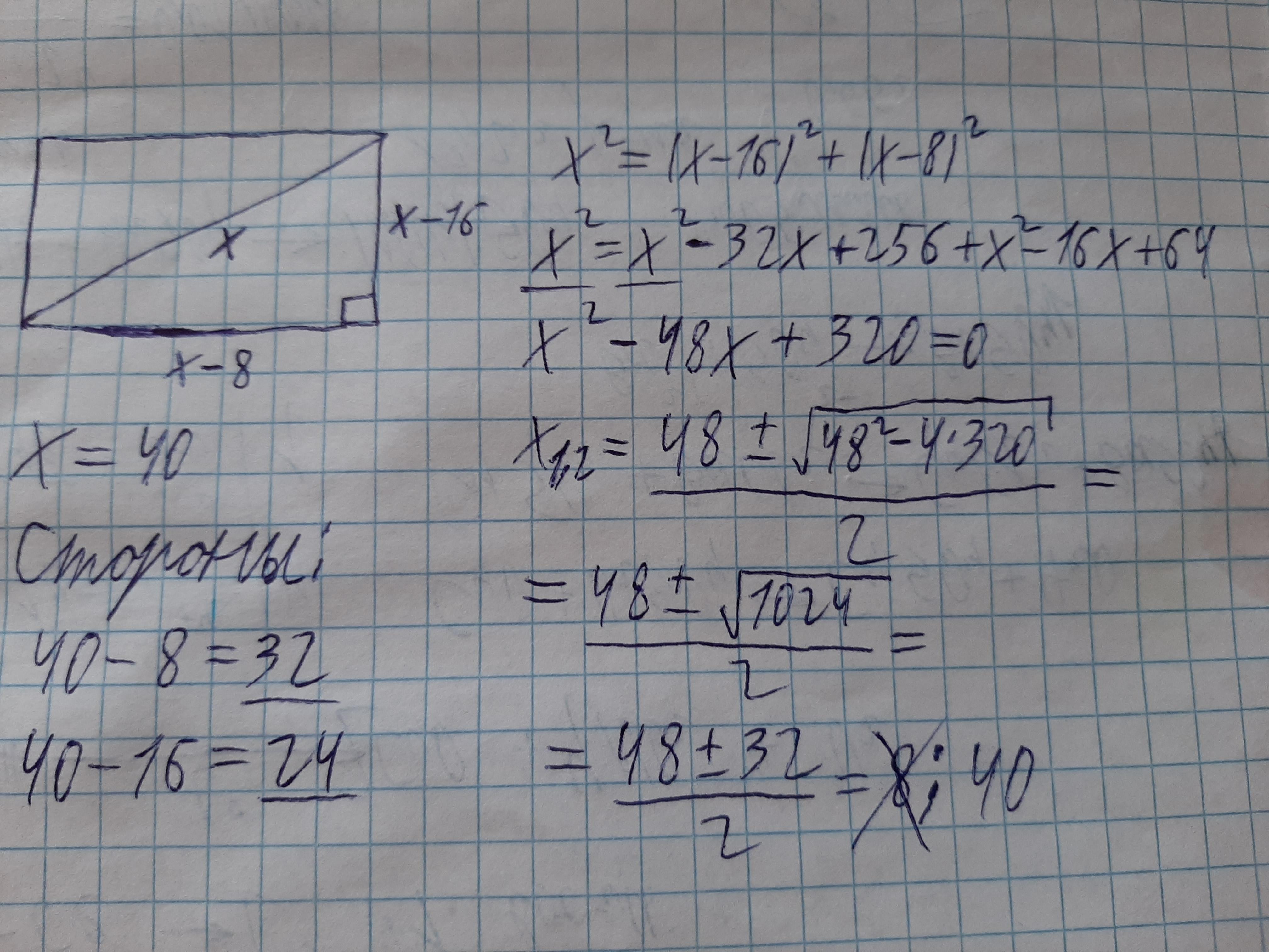 Диагональ прямоугольника на 8 см больше одной из его сторон и на 16 см больше другой. Найдите стороны прямоугольника.