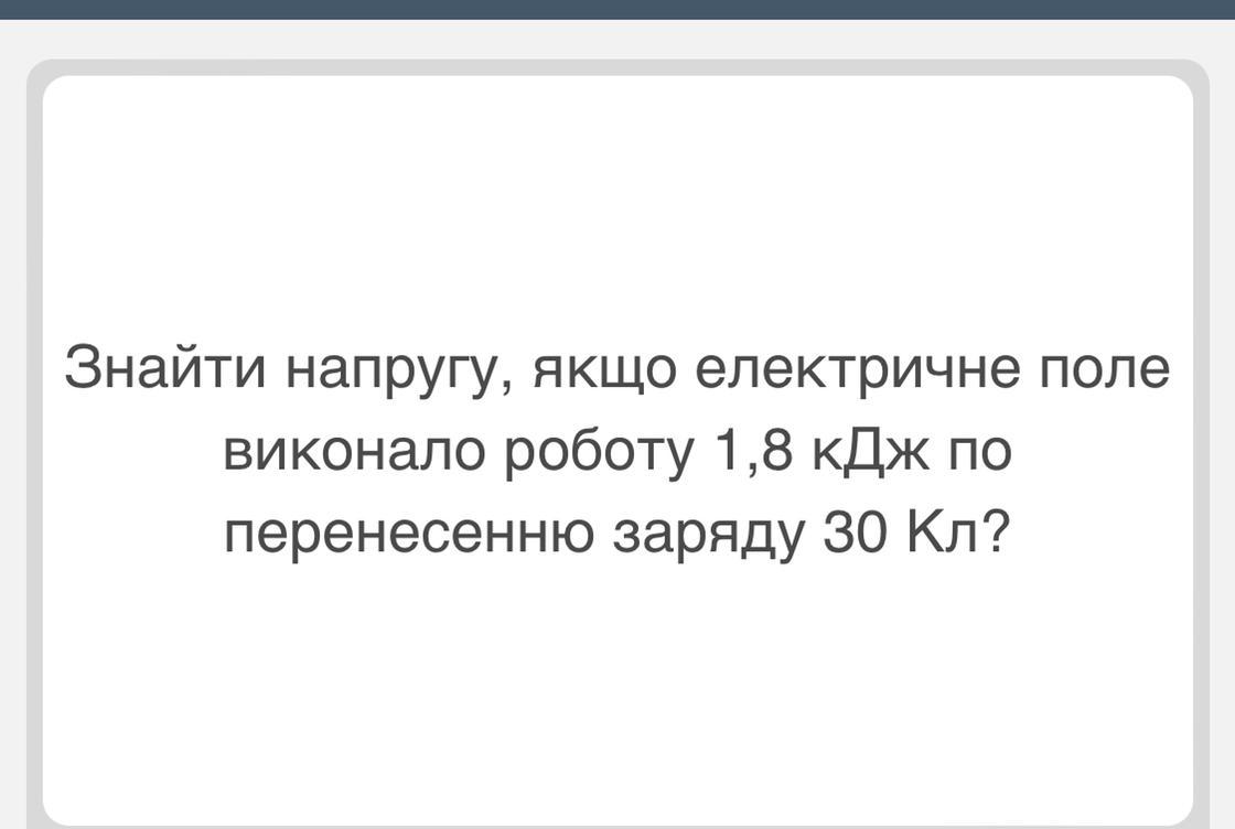 Знайти напругу,якщо електричне поле виконало роботу 1,8 КДж по перенесенню заряду 30 кл?