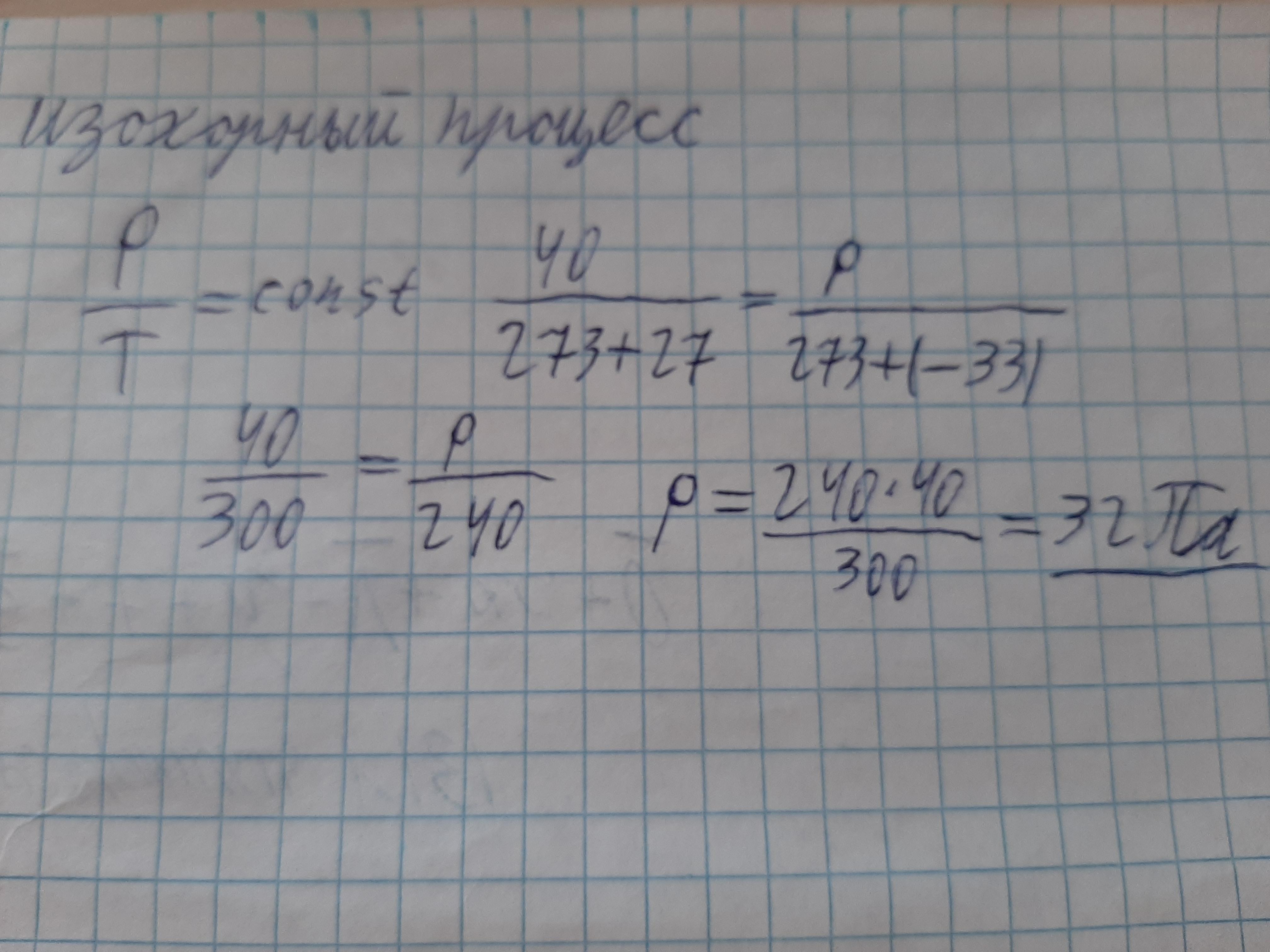 В баллоне находится газ под давлением 40 Па и при температуре 27 °С. Баллон охлаждали и температура снизилась до -33 °С при неизменном объеме и массе газа. Определить давление газа после охлаждения.