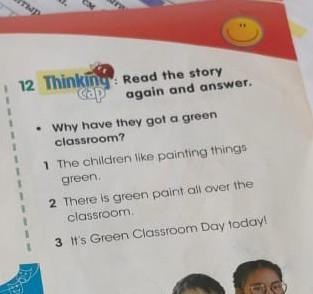 Read cap Why have they got a green classroom? 1 The children like painting things green. 2 There is green paint all over the classroom. 3 It's Green Classroom Day today! Пожалуйста помогите пожалуйста срочно
