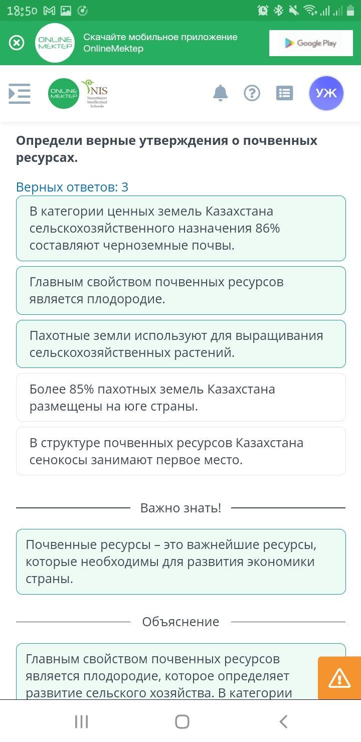 Типы почв в Казахстане Определи верные утверждения о почвенных ресурсах. Верных ответов: 3 В структуре почвенных ресурсов Казахстана сенокосы занимают первое место. Более 85% пахотных земель Казахстана размещены на юге страны. Главным свойством почвенных ресурсов является Плодородие. В категории ценных земель Казахстана сельскохозяйственного назначения 86% составляют черноземные почвы. Пахотные земли используют для выращивания сельскохозяйственных растений. е Назад Проверить