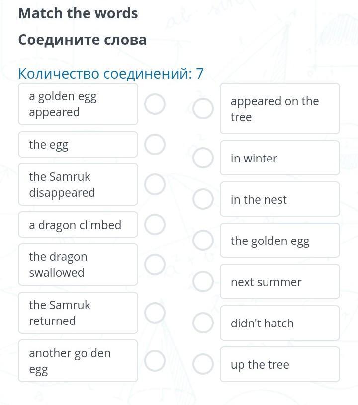 Match the words Соедините слова Количество соединений: 7 a golden egg appeared appeared on the tree the egg the Samruk disappeared in winter in the nest a dragon climbed the dragon swallowed the Samruk returned the golden egg next summer didn't hatch another golden egg up the tree