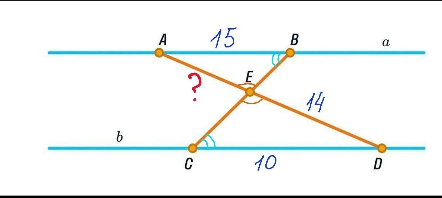 а II b, AB ∈ a, CD ∈ b. Найти длину отрезка AE, если DE=14см, CD=10см, AB=15см.