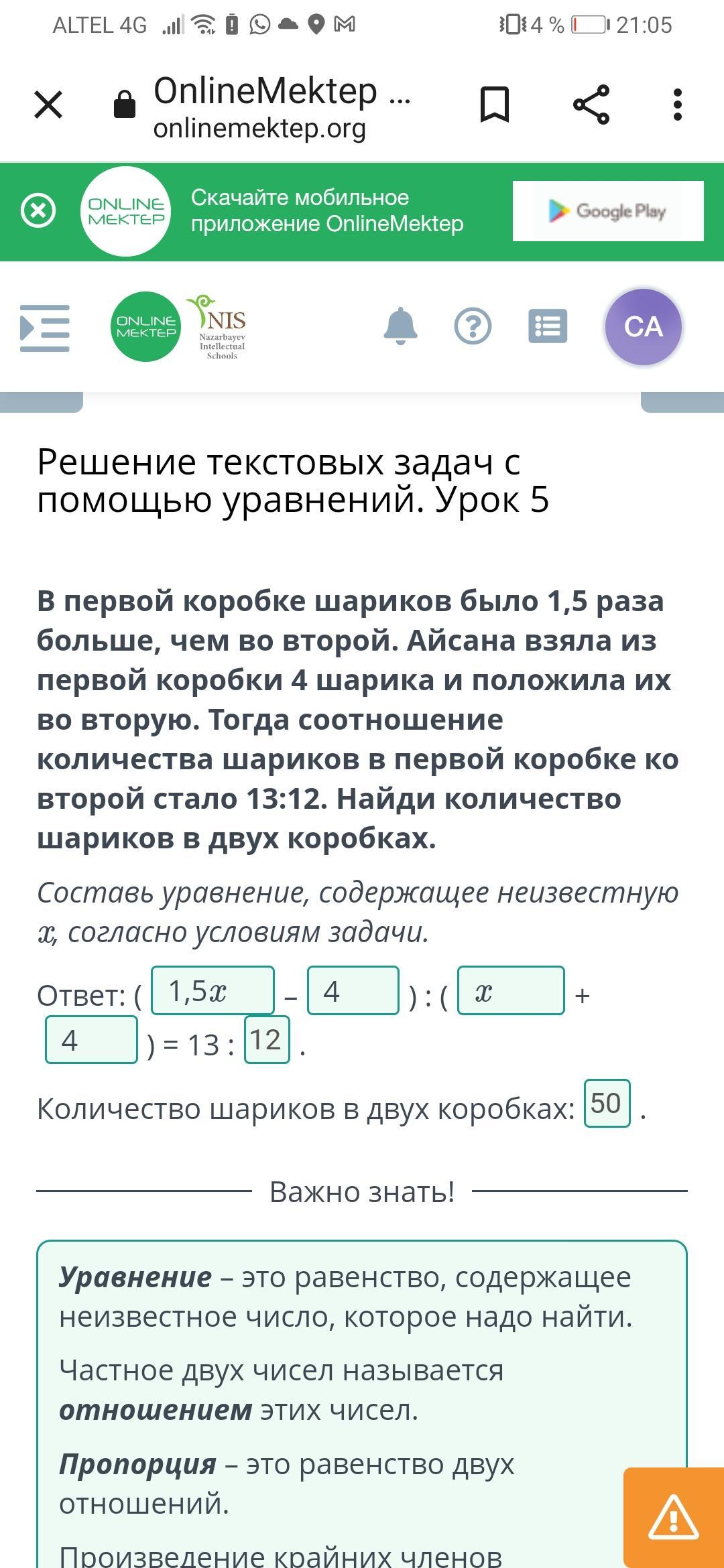 В первой коробке шариков было 1,5 раза больше, чем во второй. Айсана взяла из первой коробки 4 шарика и положила их во вторую. Тогда соотношение количества шариков в первой коробке ко второй стало 13:12. Найди количество шариков в двух коробках. Составь уравнение, содержащее неизвестную т, согласно условиям задачи. Количество шариков в двух коробках: