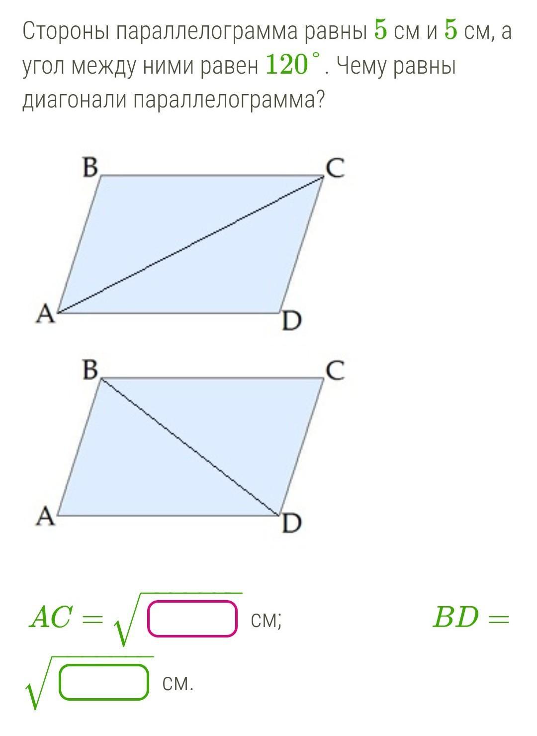 Стороны параллелограмма равны 5 и 5 см а угол между ними равен 120°. Чему равны диагонали параллелограмма?
