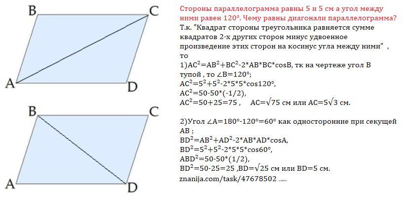 стороны параллелограмма равны 5 и 5см а угол между ними равен 120°. Чему равны диагонали параллелограмма?