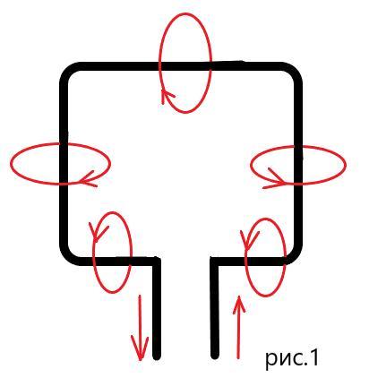 1. На рисунке 117 изображён проволочный прямоугольник, направле- ние тока в нём показано стрелками. Перечертите рисунок в тетрадь. и, пользуясь правилом буравчика, начертите вокруг каждой из его четырёх сторон по одной магнитной линии, указав стрелкой её на правление.