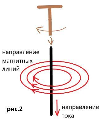 Для определения направления магнитных линий возле проводника с током существует правило буравчика: если вкручивать буравчик по направлению тока в проводнике, то направление вращения ручки буравчика укажет направление линий магнитного поля тока (рис.2).