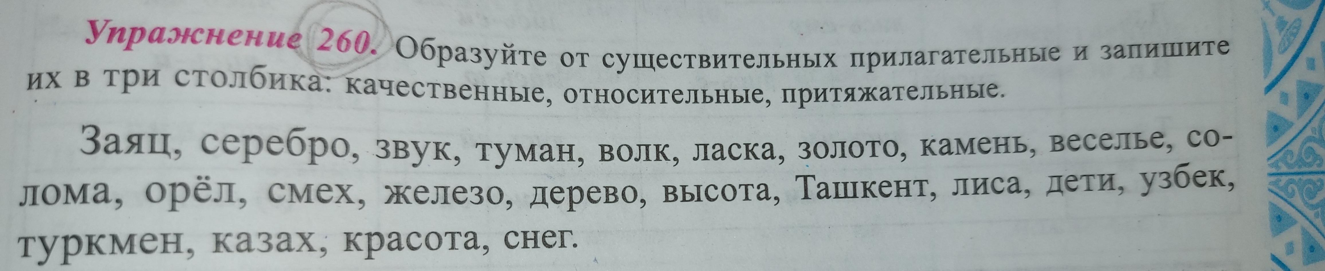 Относительные: серебряный, звуковой, туманный, золотой, каменный, соломенный, ореховый, железный, деревянный, ташкентский, детский,узбекский, туркменский, снежный.