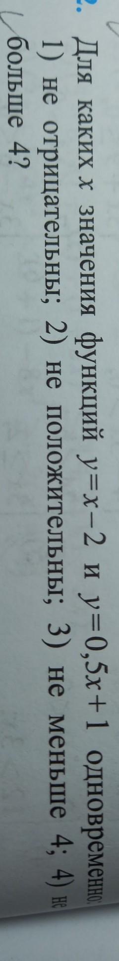 Для каких х значения функций у=х-2 и у= 0,5х+1 одновременно 1) не отрицательны; 2) не положительны; 3) не меньше 4; 4) не больше 4?