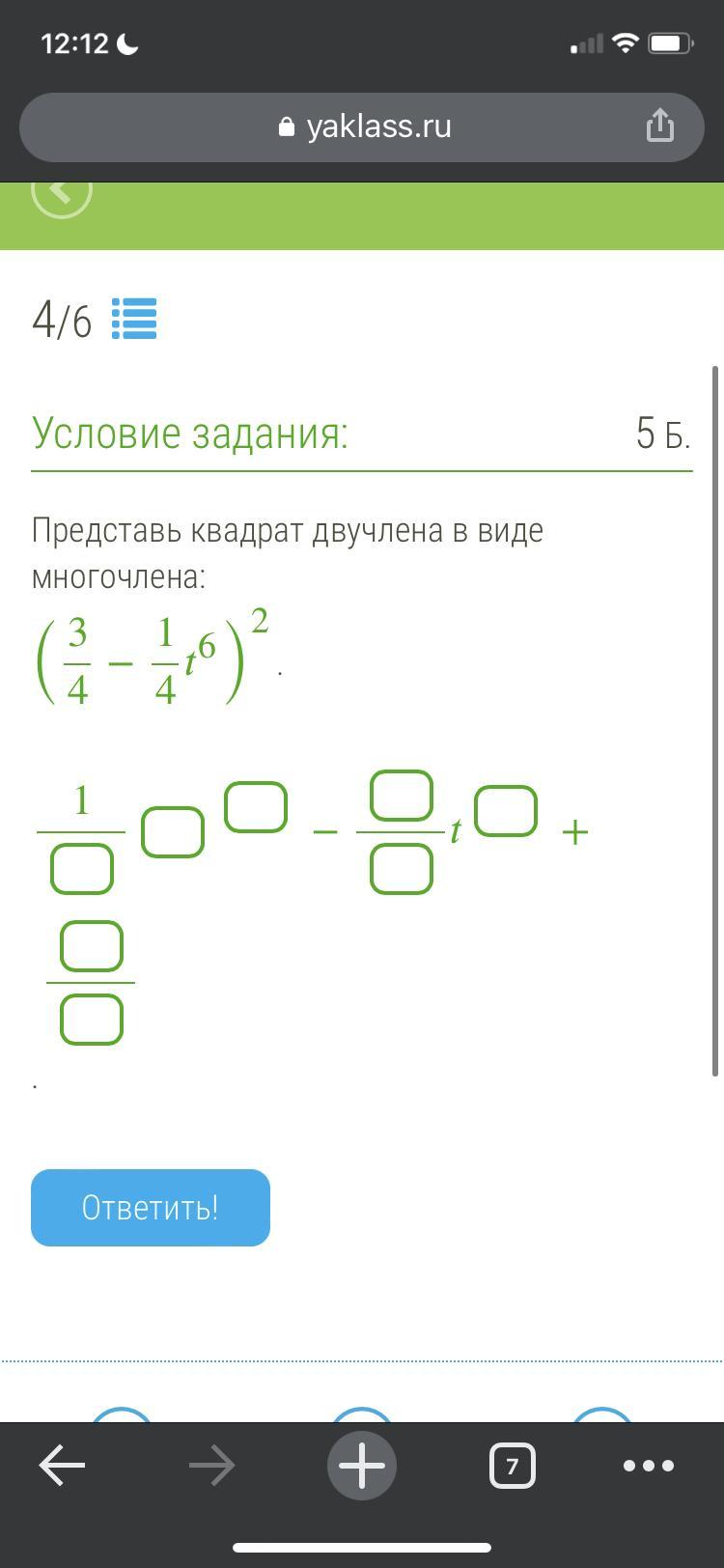 сразу скажу я выражение поменяла местами (1/4t⁶-3/4)²