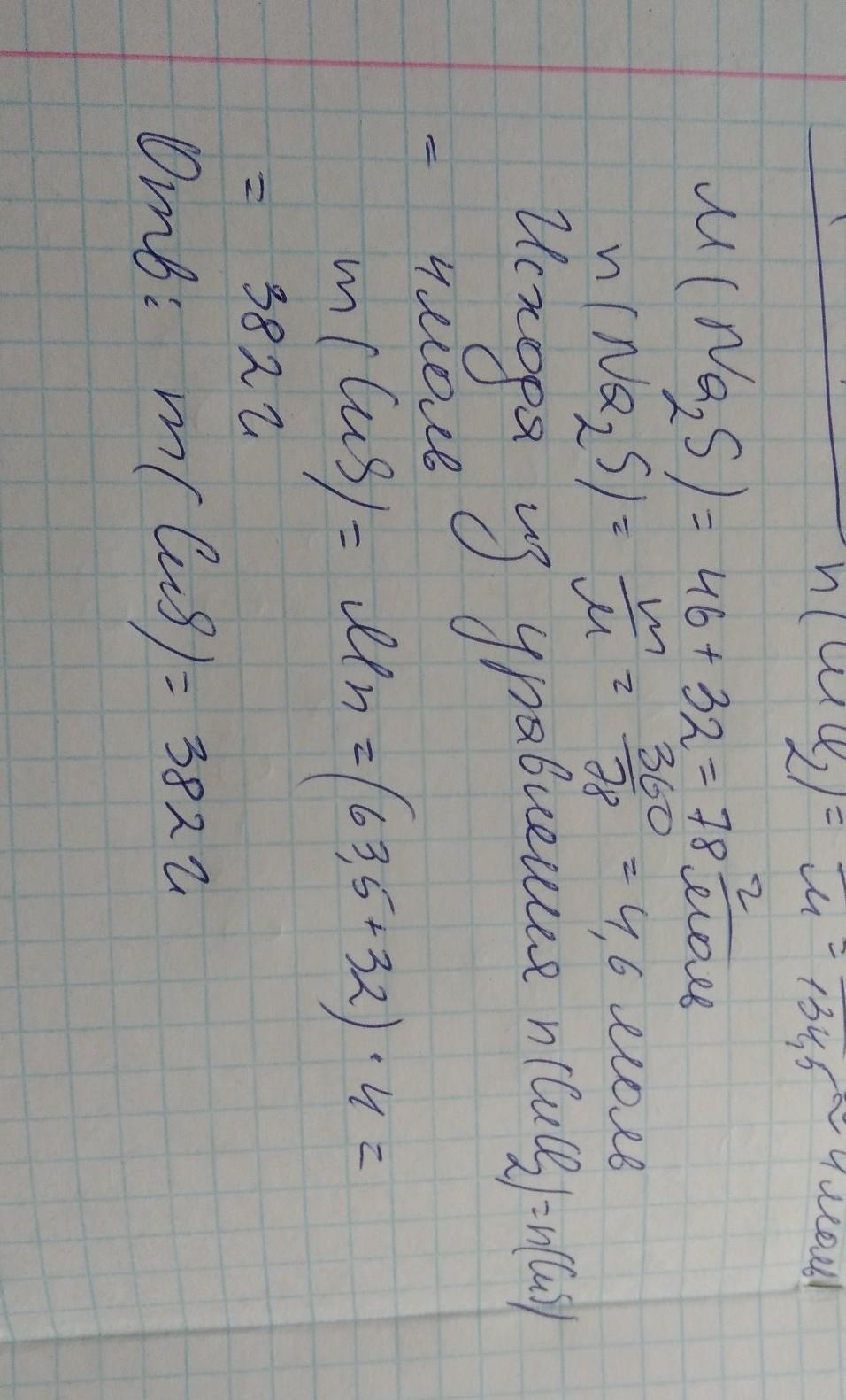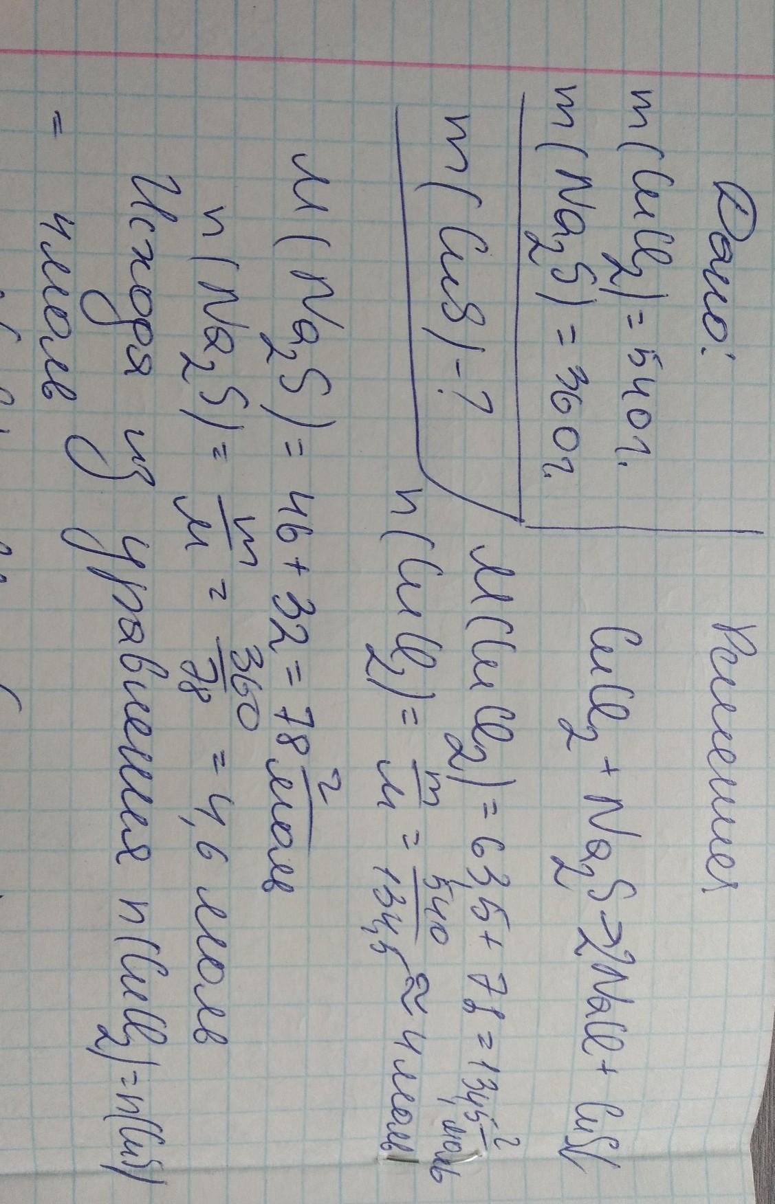 я нашел кол-во веществ cucl2 и na2s и оказалось, что n(cucl2)=4 моль, а n(na2s)= 4.6 моль, значит мы имеем недостаточное кол-во купрум хлорида для подного взаимодествия с 4.6 моль сульфида натрия. Исходя из этого уравниваем CuS именно с CuCl2, а не с Na2S