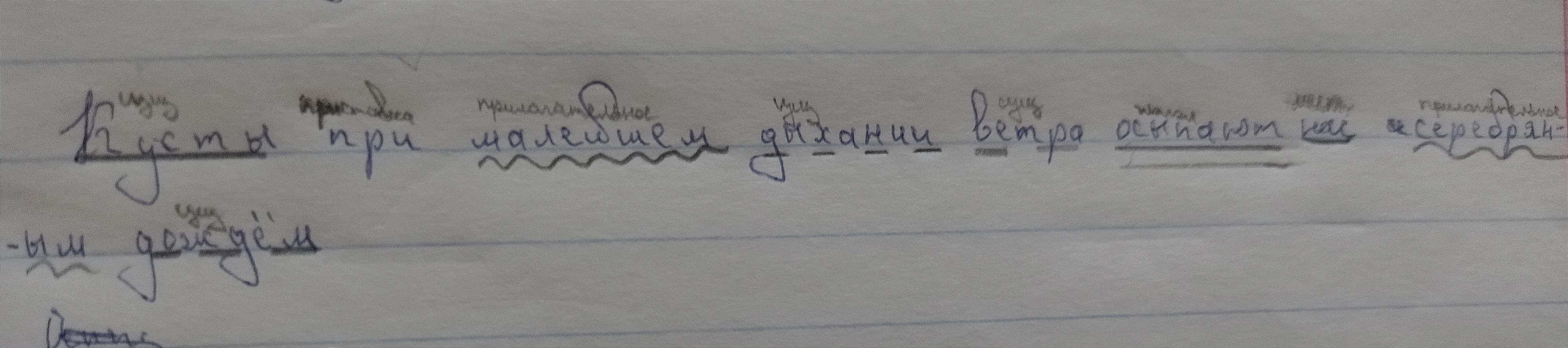 Кусты (подлежащее) при малейшем (определение) дыхании (дополнение) ветра (дополнение) осыпают (сказуемое) нас (дополнение) серебряным (определение) дождём (дополнение)