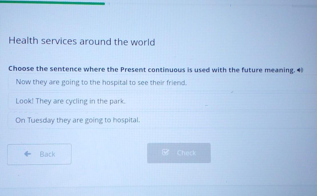 Health services around the world Choose the sentence where the present continuous is used with the future meaning. =) Now they are going to the hospital to see their friend. Look! They are cycling in the park.. On Tuesday they are going to hospital. Check Back