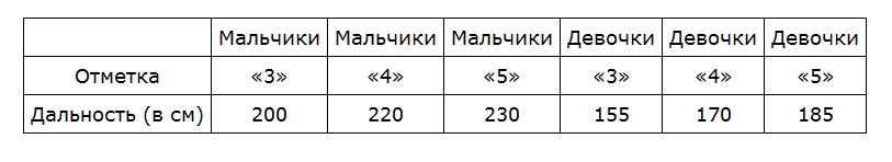 В таблице приведены нормативы по прыжкам в длину с места для 11 класса.