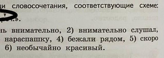 178. Найди словосочетания, соответствующие схеме: K к всег × «глаг. + нареч.». затордео мож и н 1) очень внимательно, 2) внимательно слушал, 3) пальто нараспашку, 4) бежали рядом, 5) скоро наступят, 6) необычайно красивый.