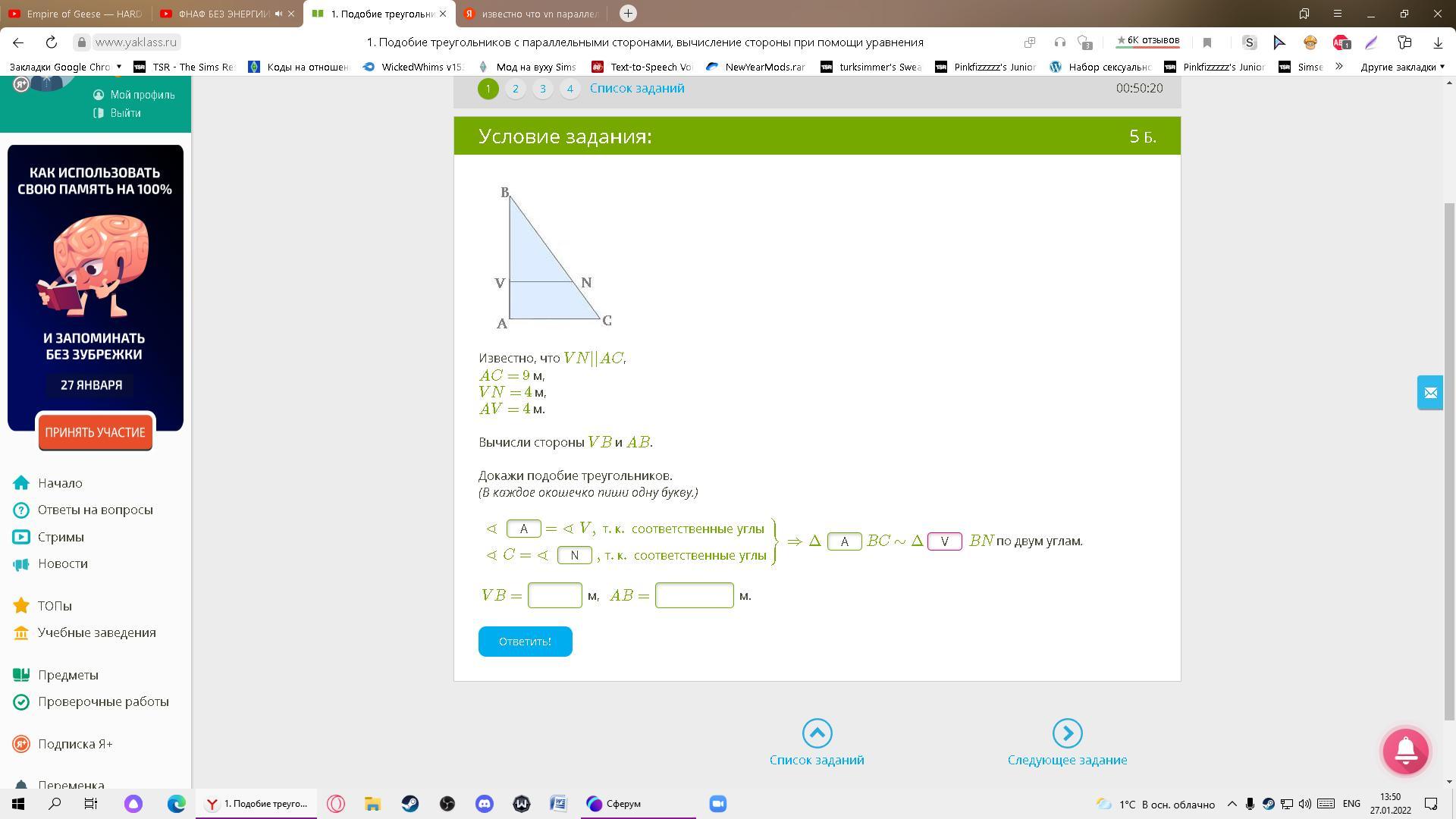 x=4/1,24=3,2 м - VВ, AB=3,2+4=7,2 м;