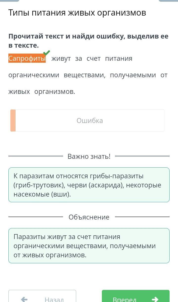 Прочитай текст и найди ошибку, выделив ее в тексте. Сапрофиты живут за счет питания органическими веществами, получаемыми от живых организмов.