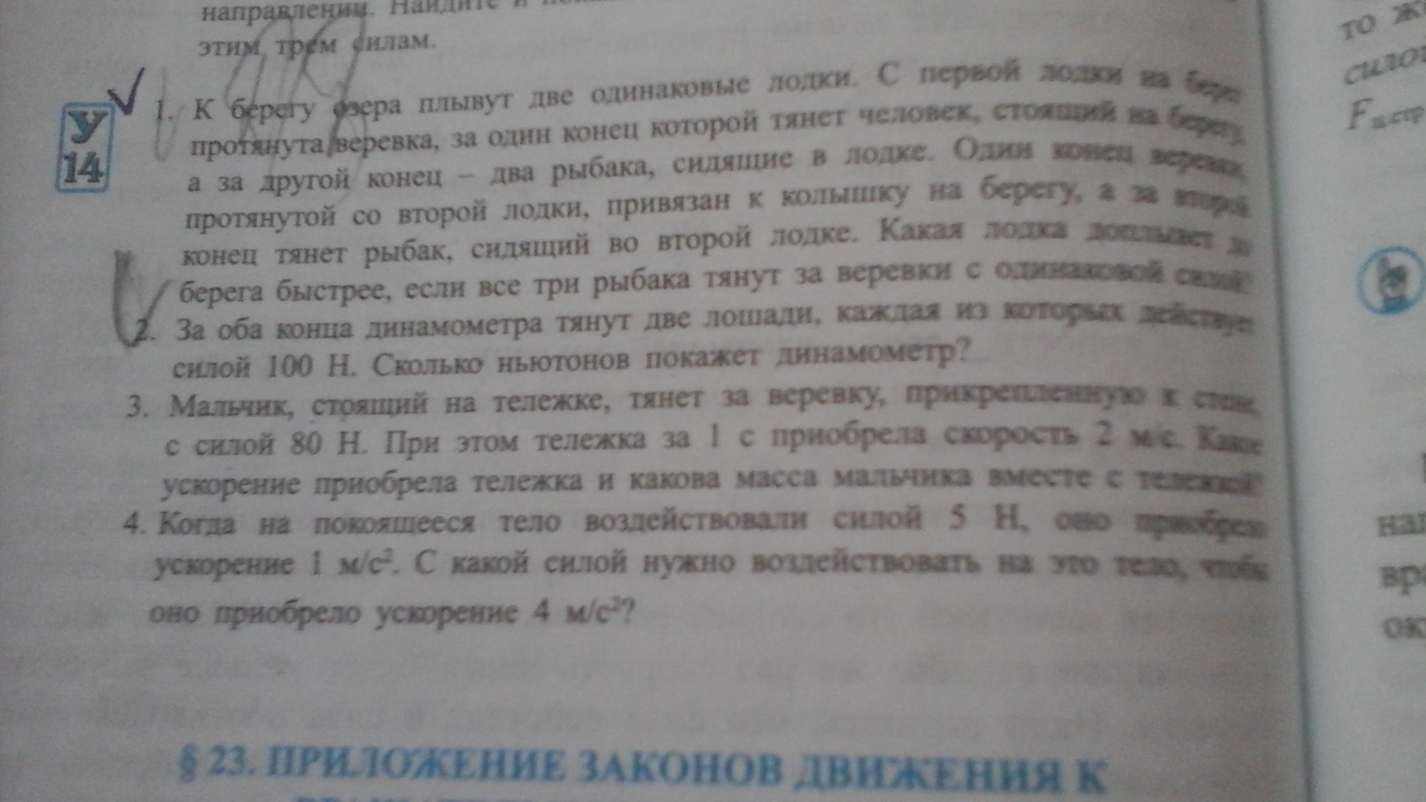 Мальчик, стоящий на тележке, тянет за веревку, прикрепленную к стене, с силой 80 Ньютон. При этом тележка за 1 секунду приобрела скорость 2 м/с. Какон ускорение приобрела тележка и какова масса мальчика вместе с тележкой?