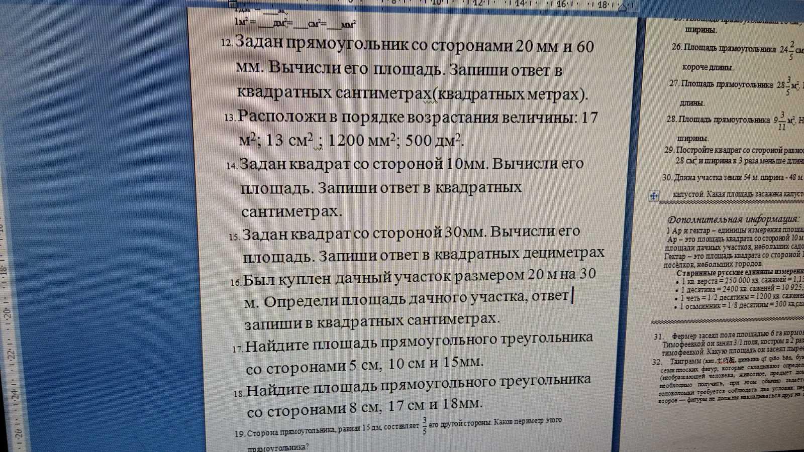 12.1200мм² 13.1200мм², 13см², 500дм², 17м² 14.1см² 15.0.09дм² 16.60000000см² 17.30мм² 18.мм²