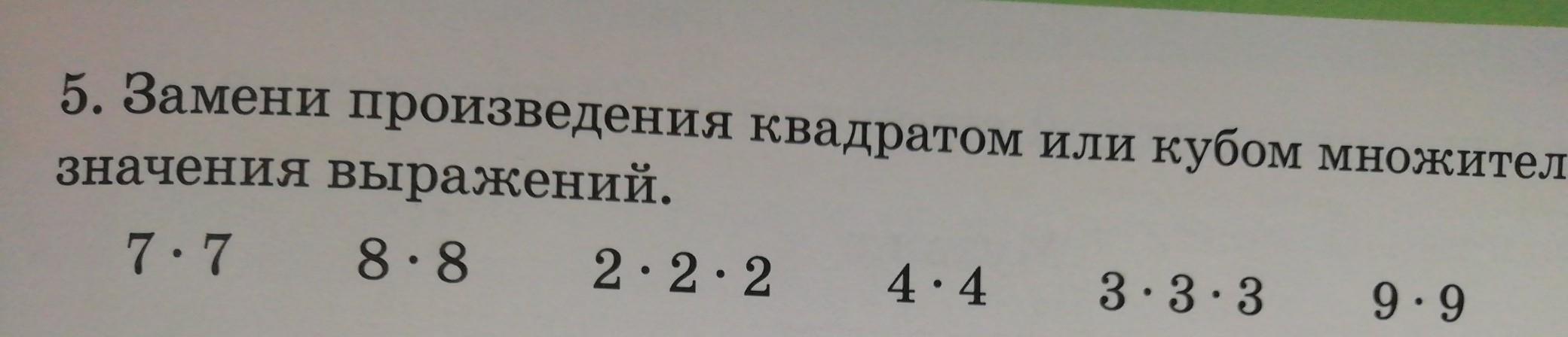 5. Замени произведения квадратом или кубом множителя. Вычисли значения выражений. 7.7 8.8 2.2.2 4.4 3.3.3 9.9
