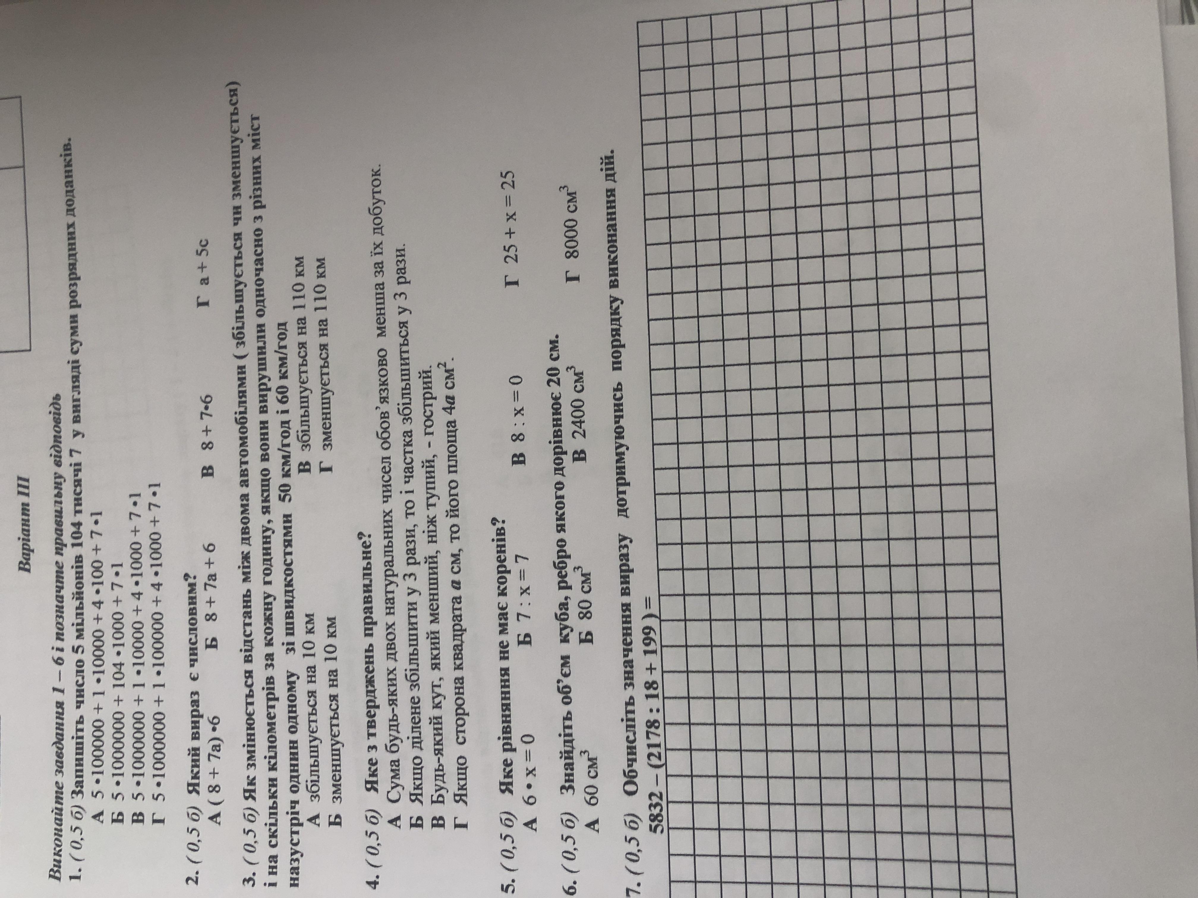 1. б; 2. в; 3. б; 4. г; 5. а; 6. б; 7. 5832-(2178:18+199)=5832-(121+199)=5832-220=5711