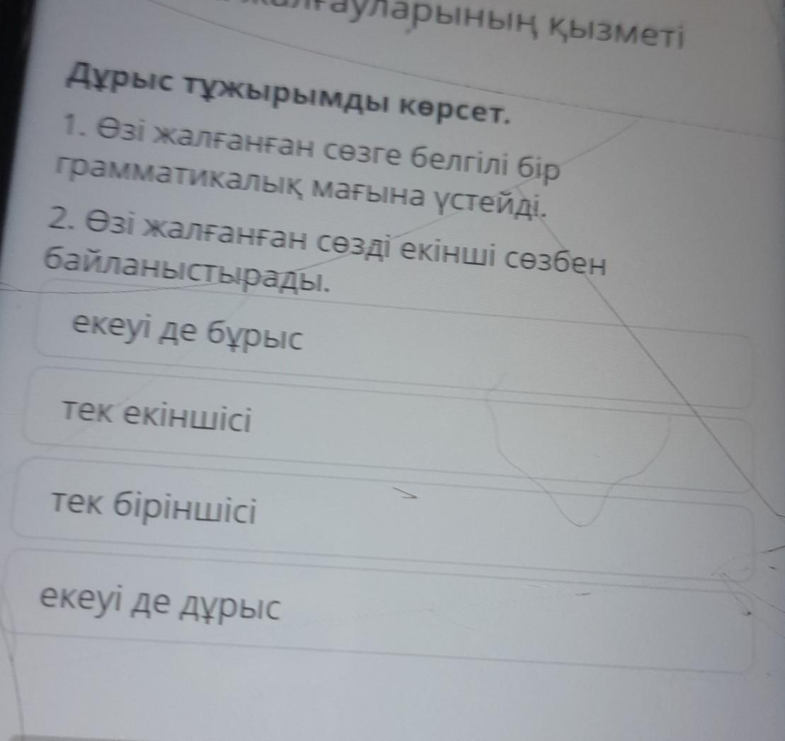 Дұрыс тұжырымды көрсет. 1. Өзі жалғанған сөзге белгілі бір грамматикалық мағына үстейді. 2. Өзі жалғанған сөзді екінші сөзбен байланыстырады. екеуі де бұрыс тек екіншісі тек біріншісі екеуі де дұрыс өтініш өтініш тез тез керек болып тұр