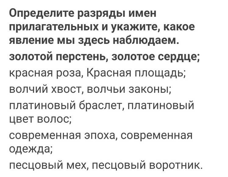 Золотой (относ.) перстень, золотое (кач.) сердце, красная (кач.) роза, Красная (относ.) площадь, волчий (притяж.) хвост, волчьи (кач.) законы, платиновый (относ.) браслет, платиновый (кач.) цвет волос, современная (относ.) эпоха, современная (кач.) одежда, песцовый (притяж.) мех, песцовый (относ.). воротник.