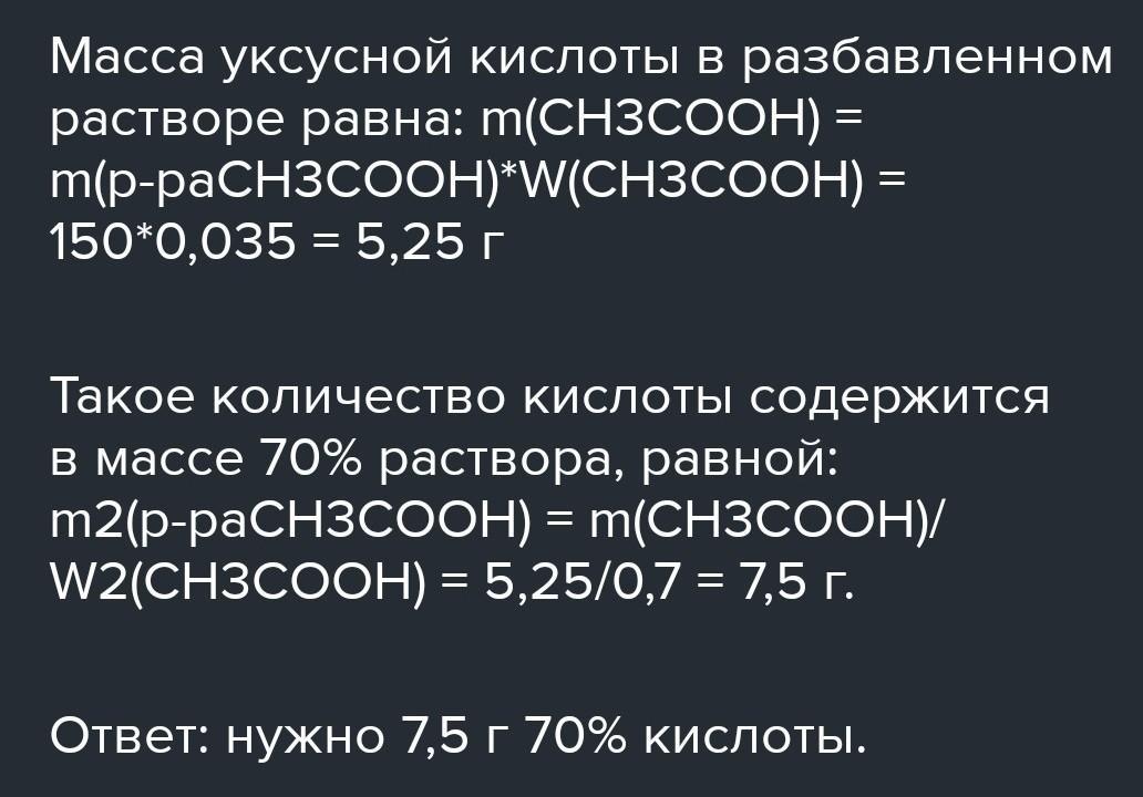 Какая масса уксусной кислоты кислоты содержится в 150 г столового уксуса с массовой долей кислоты 3,5%