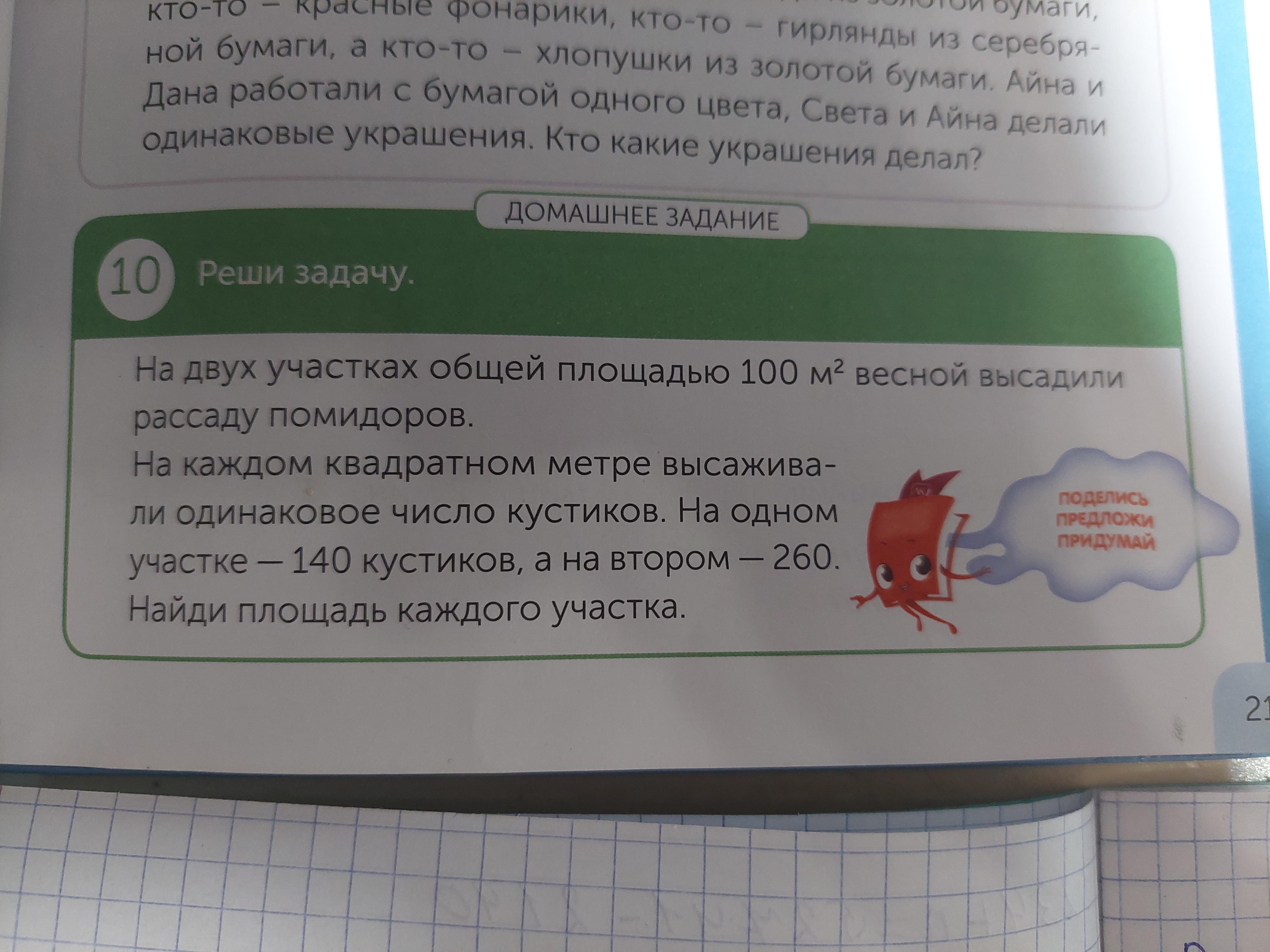 1. 140 + 260 = 400 (кустиков) помидор высадили на двух участках общей площадью 100 м²