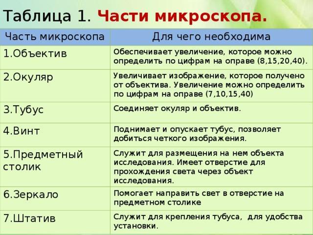 2. Изучи таблицу и сделай вывод о назначении микроскопа. Часть микроскопа Для чего необходима 1. Объективы Обеспечивает увеличение изображения или объекта. 2. Окуляр Увеличивает изображение, полученное от объектива. 3. Тубус Соединяет окуляр и объектив. 4. Предметный Служит для размещения на нем объекта исследова- столик НИЯ. 5. Зеркало Помогает направлять свет в отверстие на столике. 6. Винты Поднимают и опускают тубус или предметный сто- Лик. 7. Штатив Удерживает все части микроскопа и регулирует его положение,