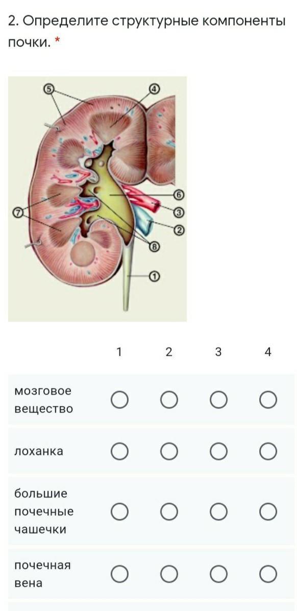 Определите структурные компоненты почки. *  1 2 3 4 5 6 7 8 мозговое вещество лоханка большие почечные чашечки почечная вена корковое вещество почечные пирамиды Помогите срочно пожалуйста