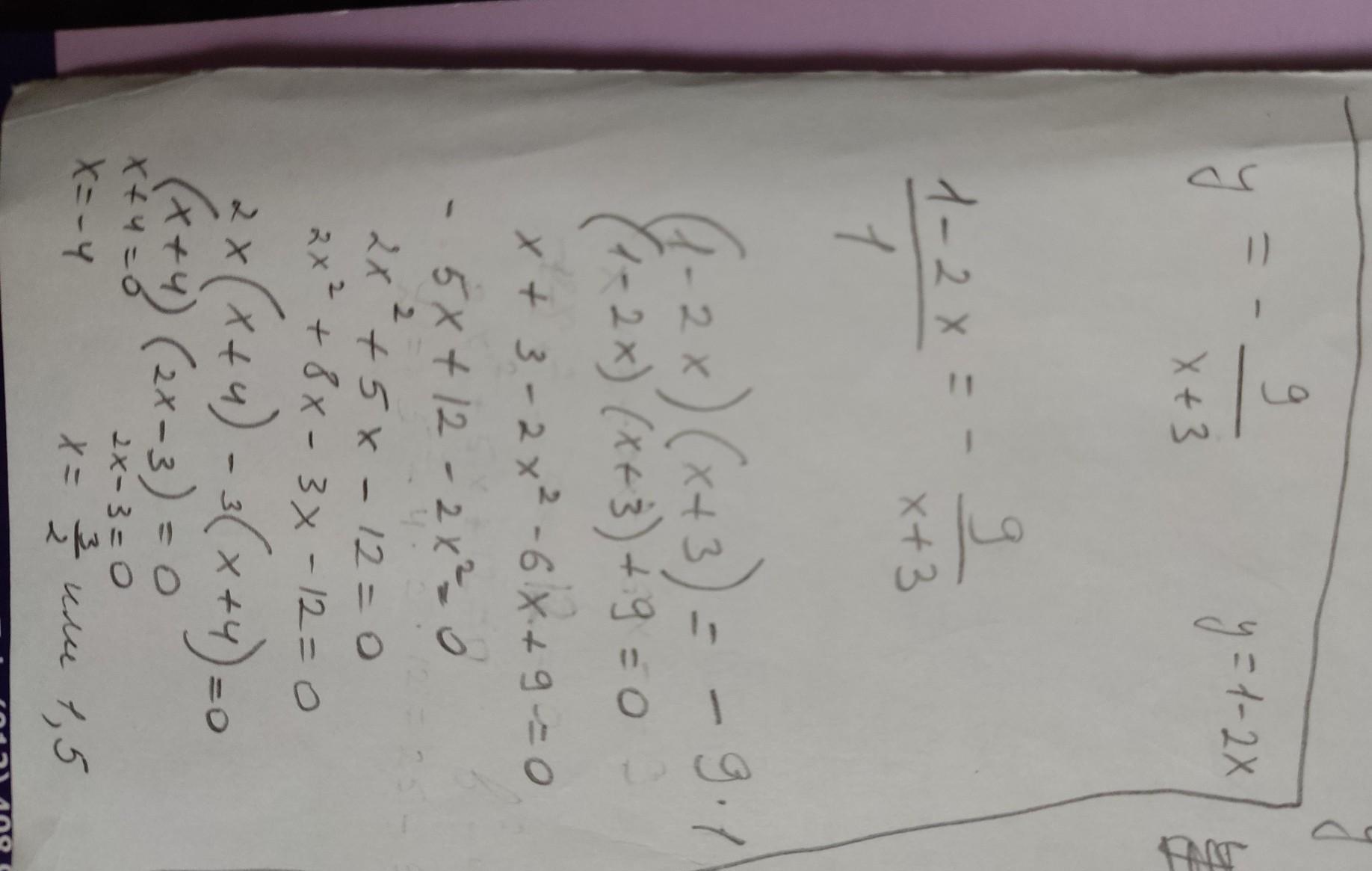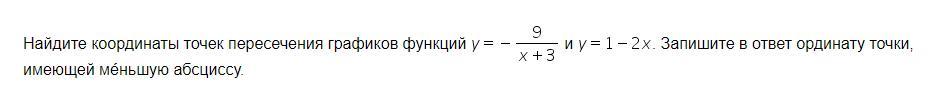 Найдите координаты точек пересечения графиков функций y equals negative fraction numerator 9 over denominator x plus 3 end fraction и y equals 1 minus 2 x. Запишите в ответ ординату точки, имеющей ме́ньшую абсциссу.