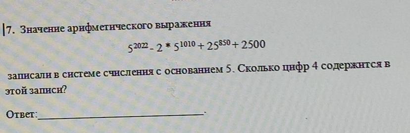 Значение арифметического выражения 5^2022 - 2*5^1010+2500 записали в системе счисления с основанием 5. Сколько цифр 4 содержится в этой записи?
