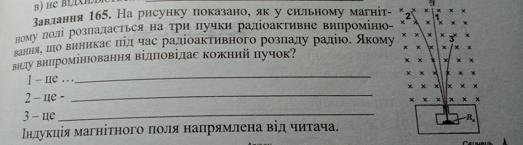 на рисунку показано, як у сильному магнітному полі розпадається на три пучки радіоактивне випромінювання, що виникає під час радіоактивного розпаду радіо. Якому виду випромінювання відповідає кожний пучок