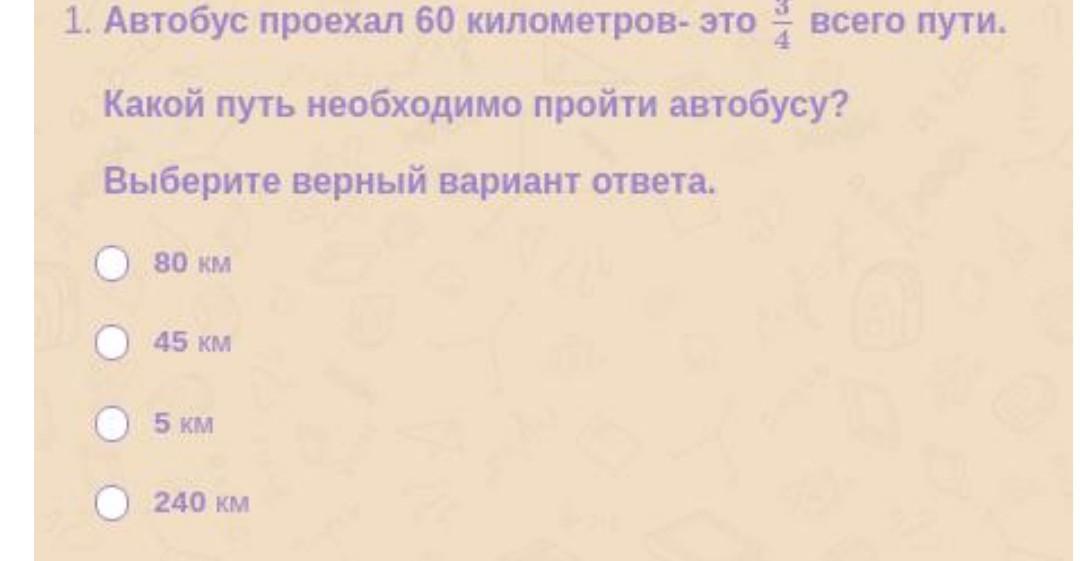 Автобус проехал 60 км это 3/4 всего пути какой путь необходима пройти автобусу? выбери верный ответ 80км 45 км 5км 240км