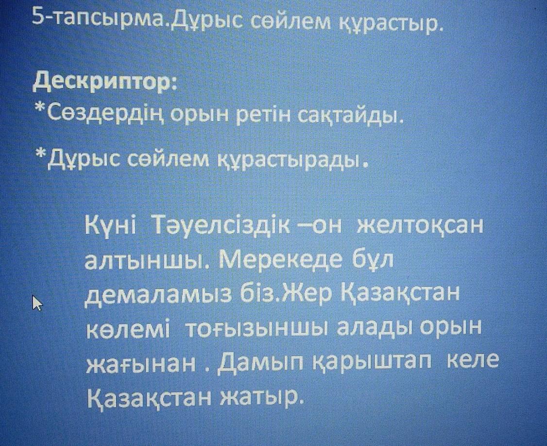 Тәуелсіздік күні - он алтыншы желтоқсан . Бұл мерекеде біз демаламыз . Қазақстан жер көлемі жағынан тоғызыншы орын алады . Қазақстан қарыштап дамып келе жатыр .
