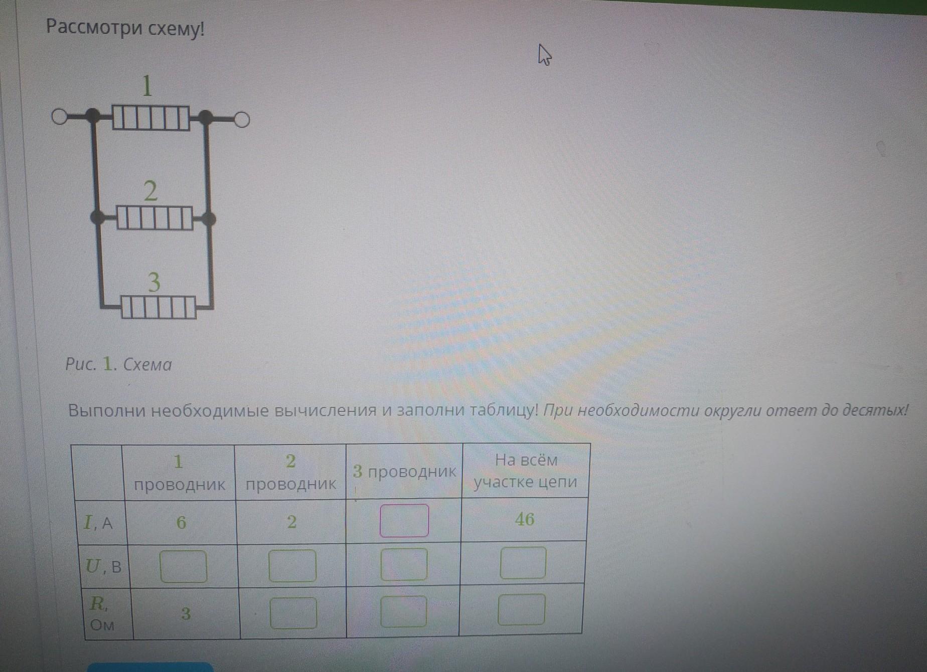 Рассмотри схему! / 2. 3 Рис. 1. Схема Выполни необходимые вычисления и заполни таблицу! При необходимости округли ответ до десятых! 1 2 З проводник На всём. участке цепи проводник проводник І, А 6 2 46 U, В R, Ом 3