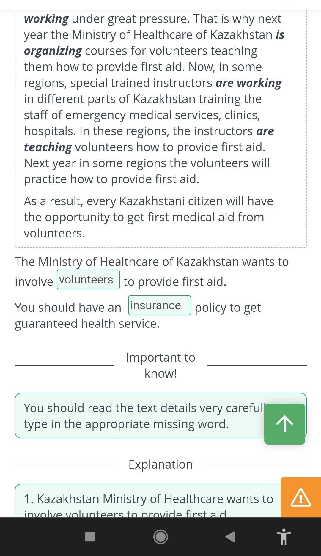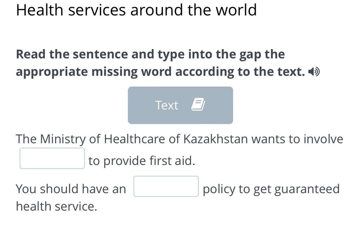 Read the sentence and type into the gap the appropriate missing word according to the text. The ministry of Healthcare of kazakhstan wants to involve…to provide first aid