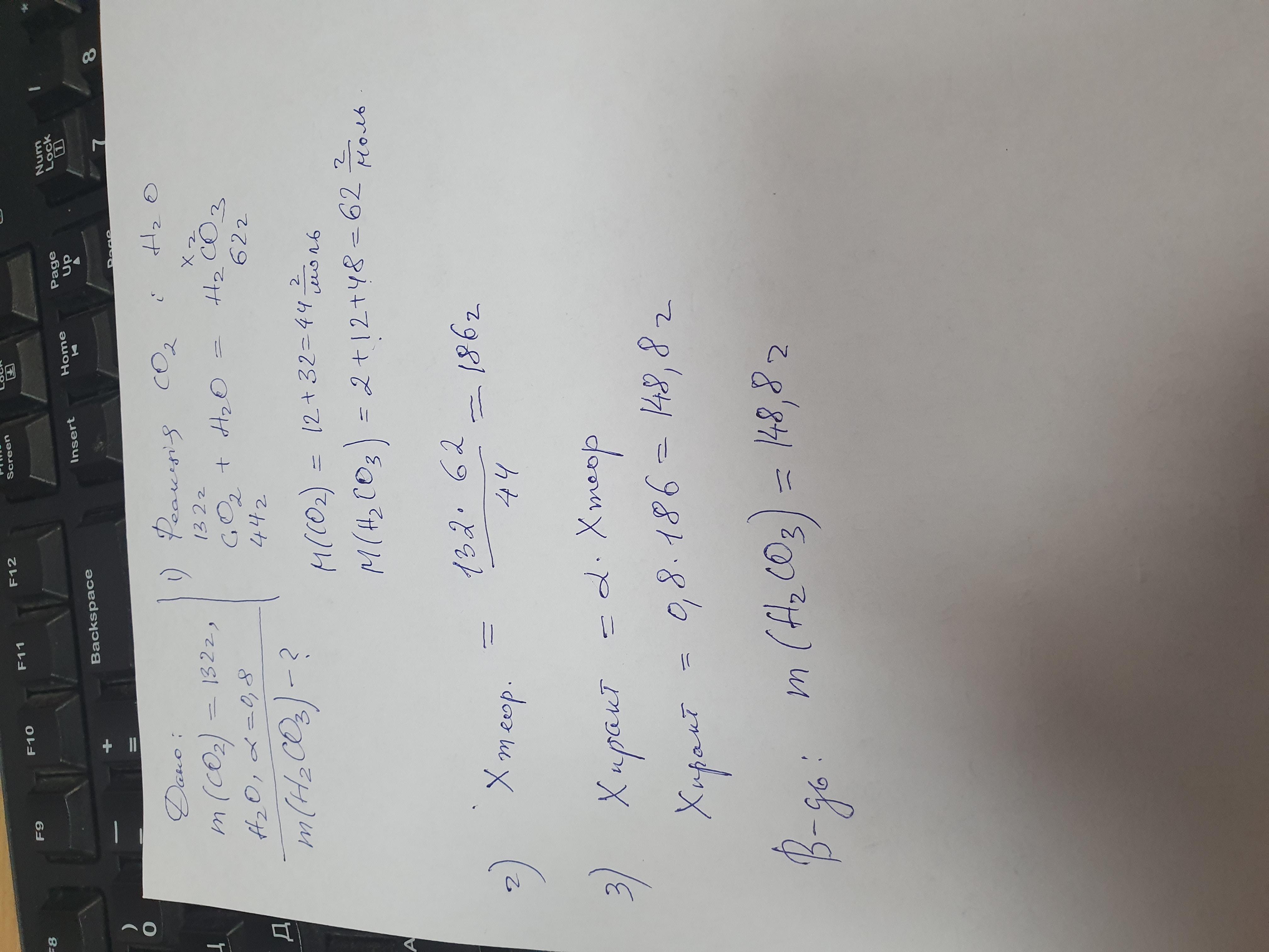 Визначити масу карбонатної кислоти, яка утвориться під час взаємодії 132 г карбон (ІV) оксиду з водою, якщо вихід продукту реакції становить 80%