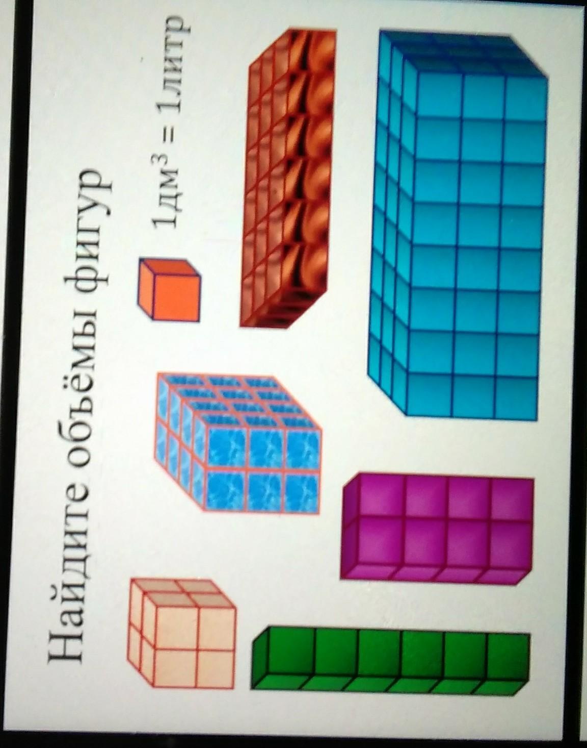 4) зеленая фигура 6 кубиков V= 6* 1дм³= 6дм³=6л
