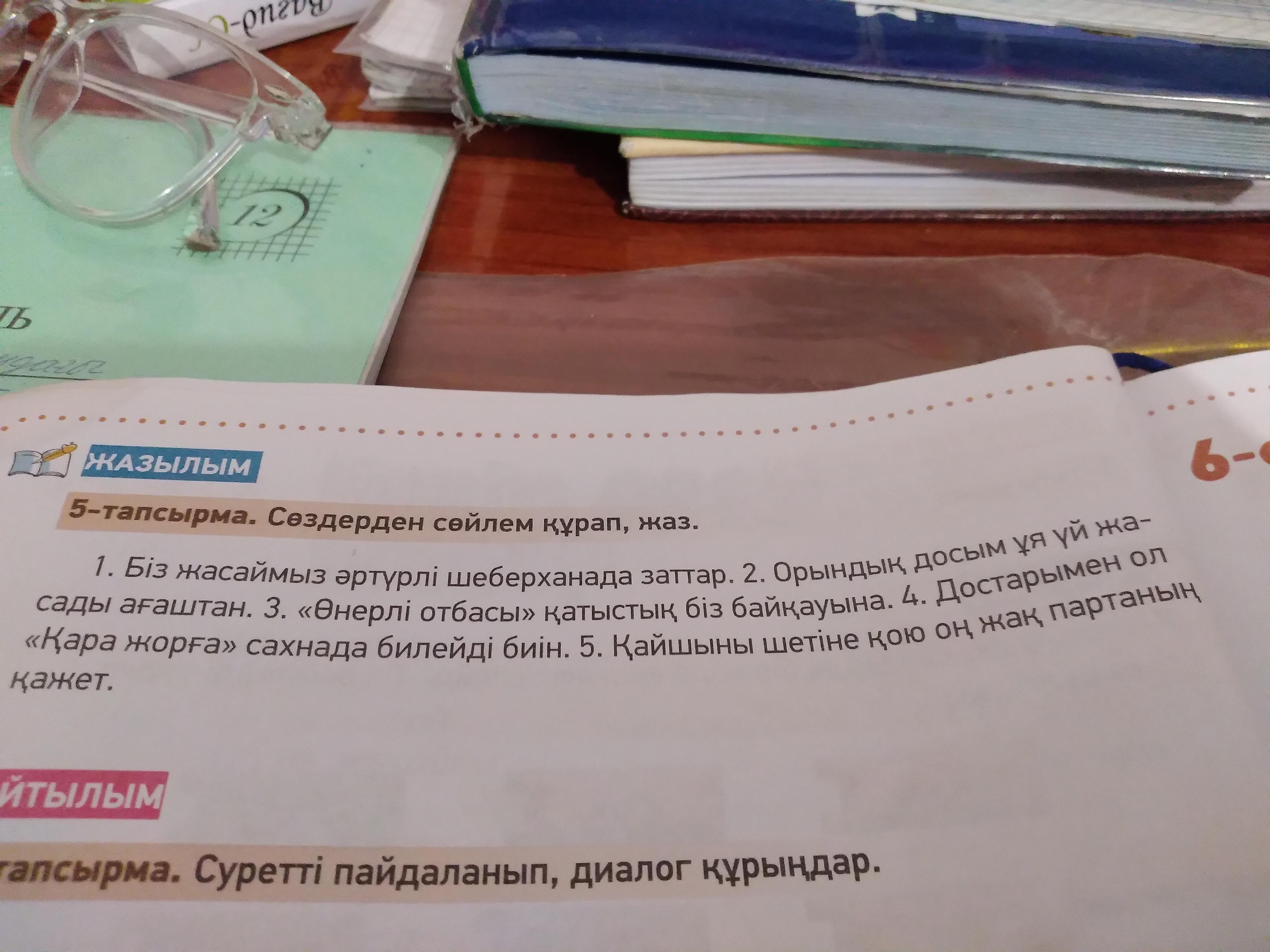 Біз шеберханада әртүрлі заттар жасаймыз.Досым ағаштан ұя үй жасады.біз өнерлі отбасы байқауына қатыстық.Ол достарымен сахнада Қара жорға биін билейді.Қайшыны оң жақ партаның шетіне қою қажет.