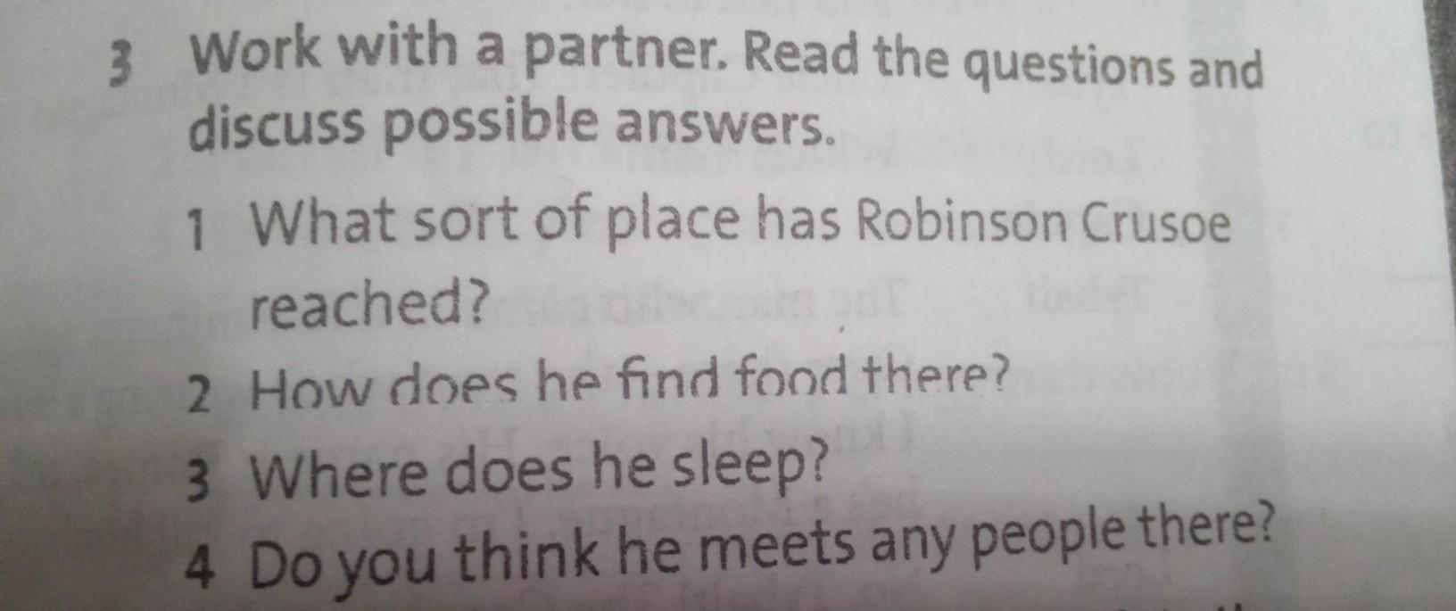 1 What sort of place has Robinson Crusoe reached? 2 How does he find food there? 3 Where does he sleep? 4 Do you think he meets any people there?