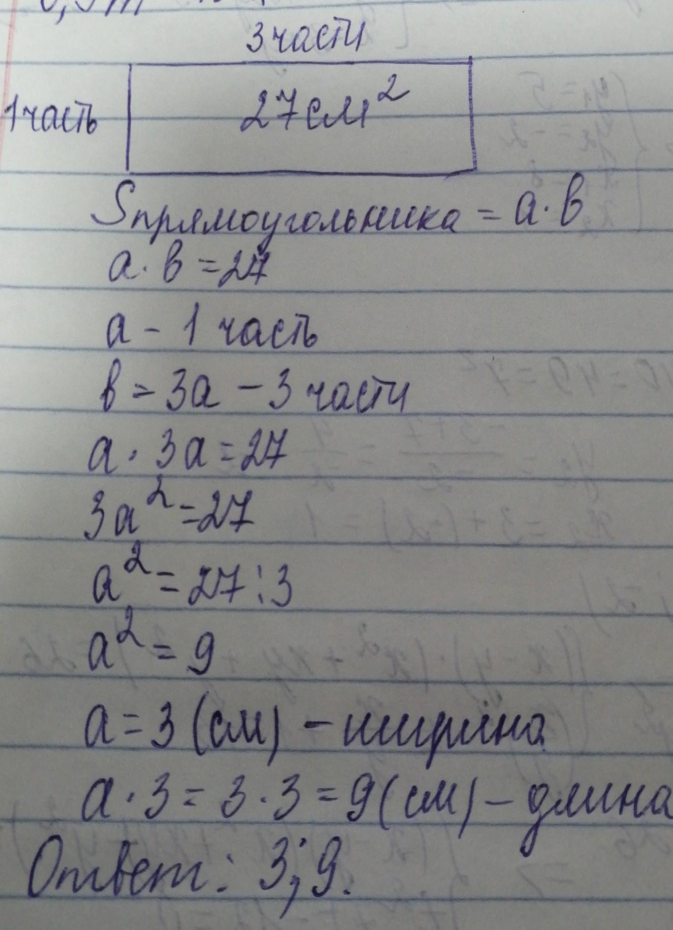 площадь прямоугольника равна 27см в квадрате а отношения его сторон 1:3