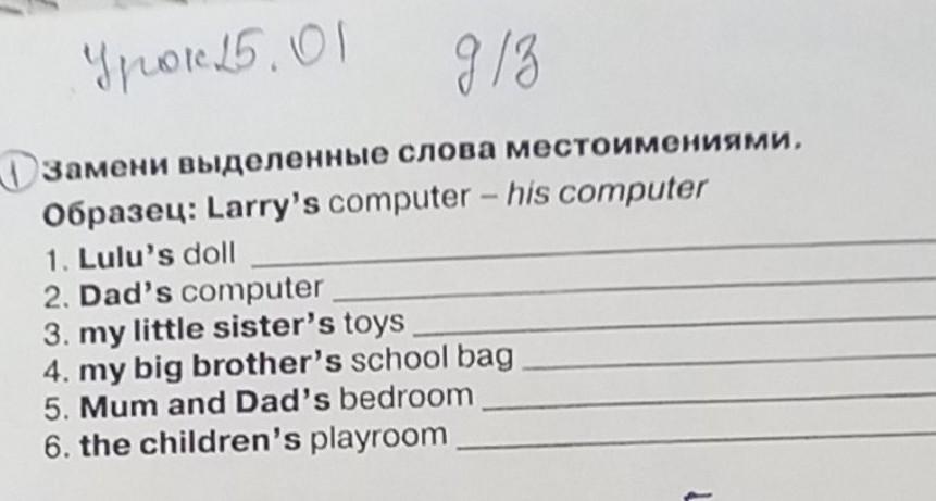 1 her doll 2 his computer 3 her toys 4 his school bag 5 their bedroom 6 their playroom