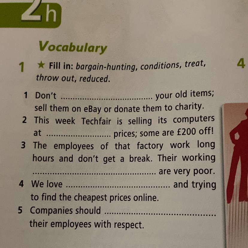 1.throw out 2.reduced 3.conditions 4.bargain-hunting 5.treat