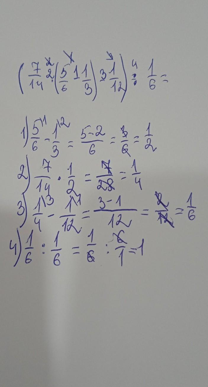 Четвёртое действие: 14/84:1/6=1 (потому что вторую дробь переворачиваем, сокращаем, получается 14/14*1/1, а 14/14 это 1, следовательно 1*1=1)