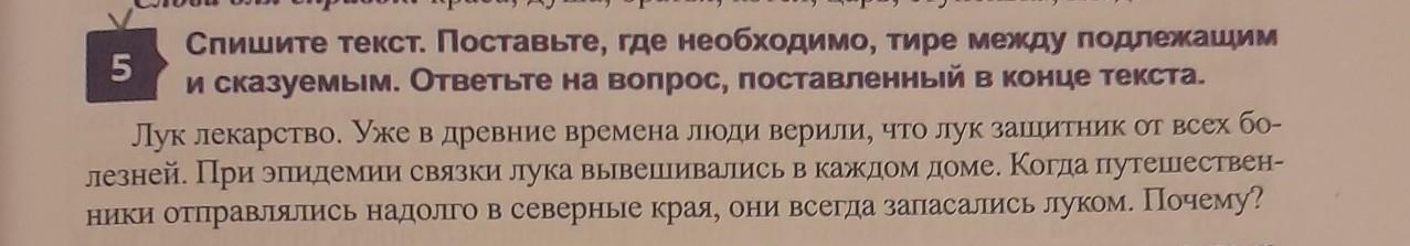 па, оратья, котел, царь, ступенька, клад Спишите текст. Поставьте, где необходимо, тире между подлежащим 5 и сказуемым. Ответьте на вопрос, поставленный в конце текста. Лук лекарство. Уже в древние времена люди верили, что лук защитник от всех бо- лезней. При эпидемии связки лука вывешивались в каждом доме. Когда путешествен- ники отправлялись надолго в северные края, они всегда запасались луком. Почему?