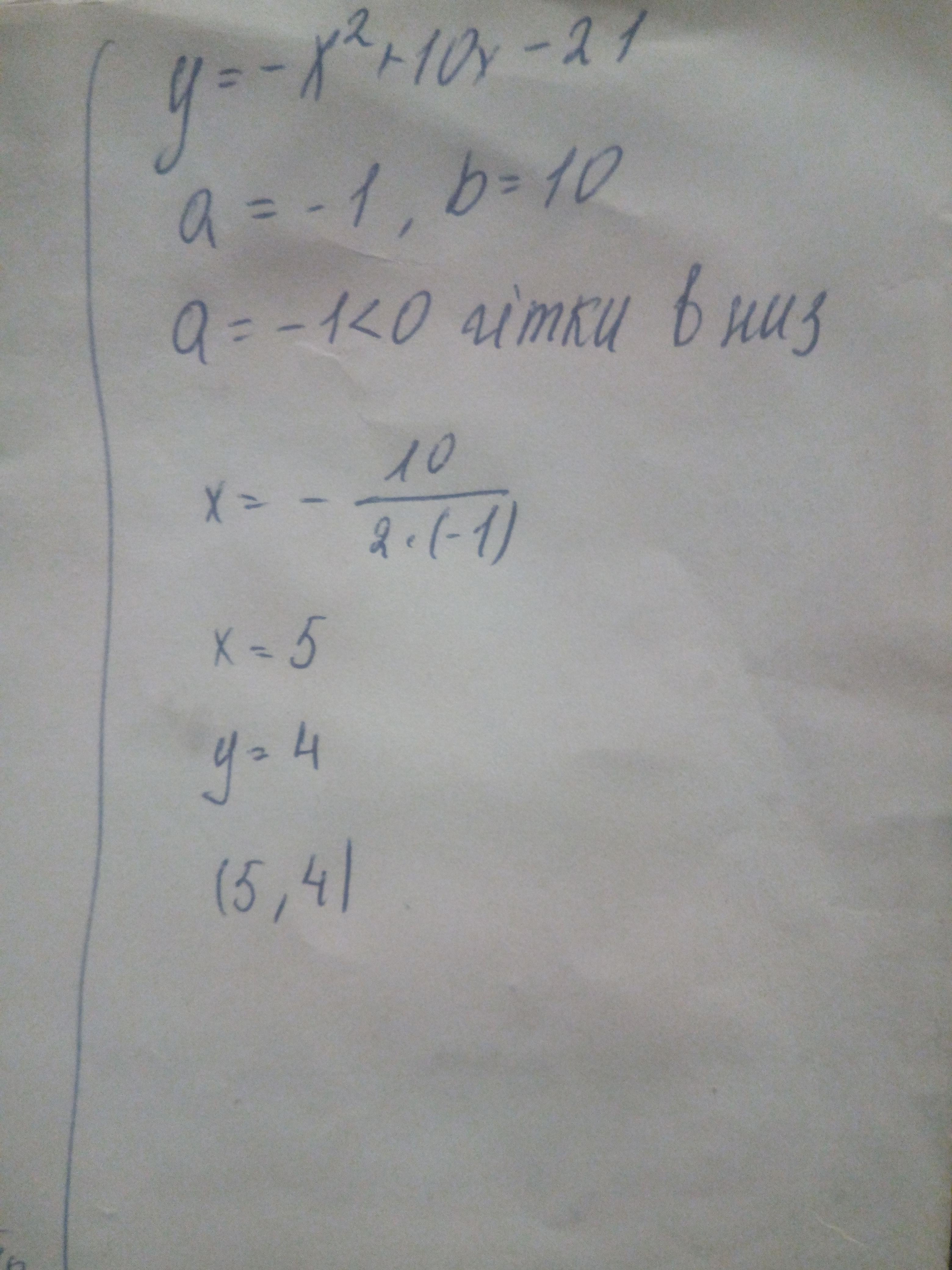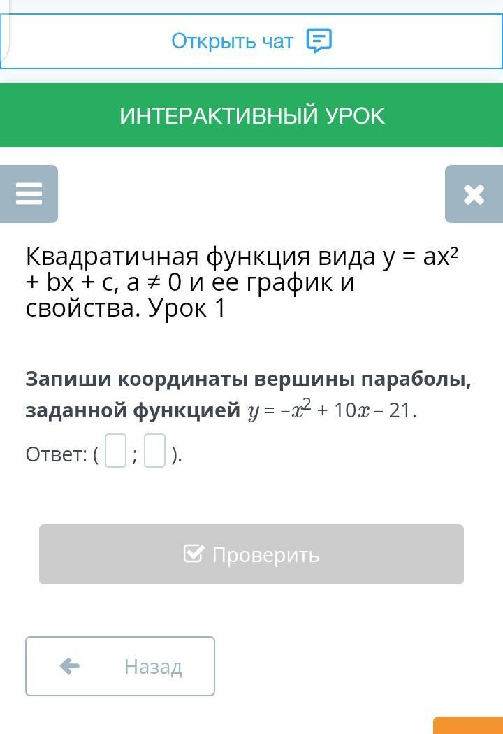 Квадратичная функция вида y = ax² + bx + c, a ≠ 0 и ее график и свойства. Урок 1 Запиши координаты вершины параболы, заданной функцией y = –x2 + 10x – 21. Ответ: ( ; ).